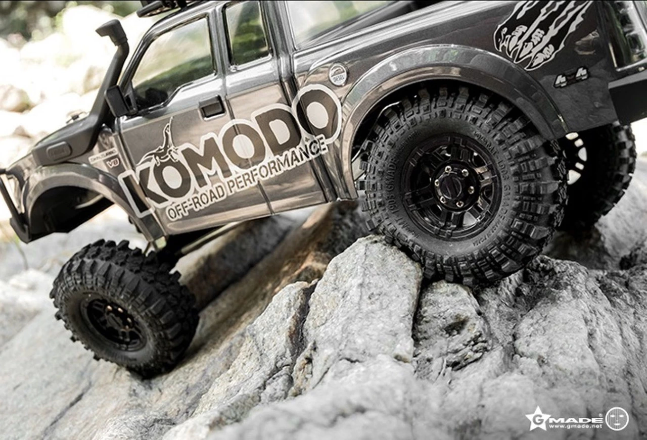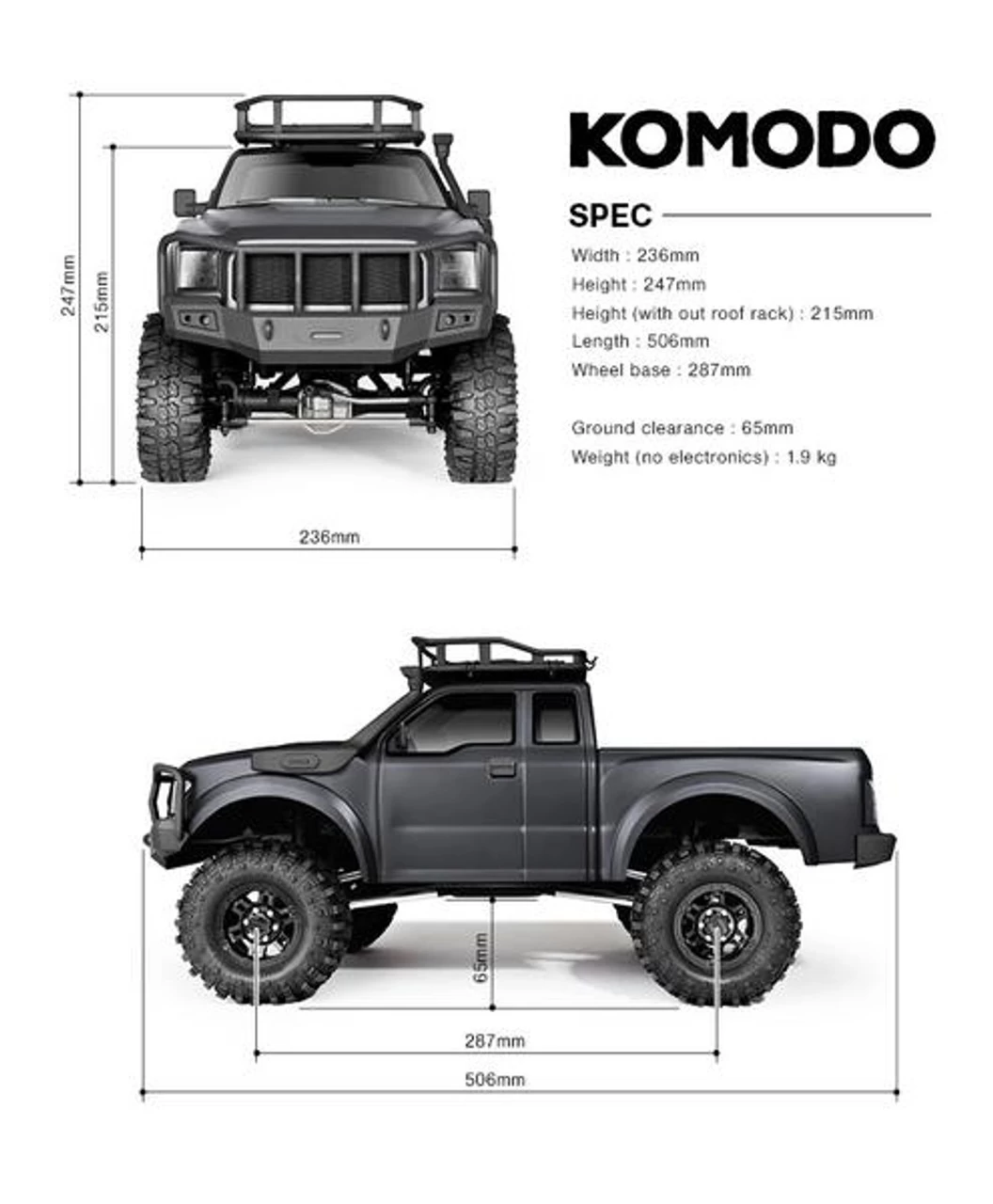 The KOMODO scale 4WD Truck is now available as an RTR. It is assembled and painted with radio and electronics installed. It is equipped with a 2.4GHz radio system, a 27-turn motor, and a high torque metal gear servo. The Komodo 4×4 RTR is built on the proven GS01 steel ladder frame with a new 4-link suspension design that features internally sprung oil filled “Transitions” shocks to provide smooth suspension travel and axle articulation. The KOMODO body set is made from extra thick (1.5mm) HD lexan, is painted metallic dark gray, and features the many scale details that customers demand. Realism like bumpers with authentic grill protection, F/R Light Buckets, wipers, snorkel, roof rack and more. This truck features the aggressive new MT-1903 tire which measures at 4.3″ (109MM) tall and is mounted on new black NR02 beadlock wheels to provide the ground clearance and traction to tame your favorite trails. Should you wish to upgrade, the standard 12mm hex design will accept your favorite aftermarket wheels and tires. Customize your rig with the wide variety of upgrades and option parts that are available.