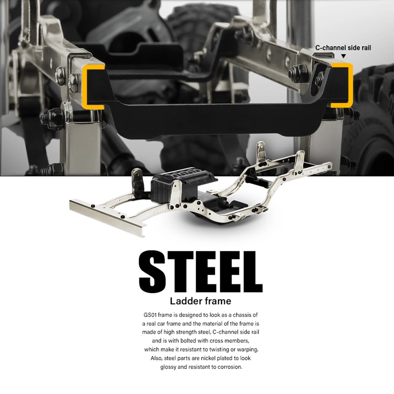 The receiver box is designed to look as a real engine cover and the function of the receiver box is to protect the receiver from getting dusty and to be used as ESC mounting space. The battery plate is designed to offer the lowest center gravity of chassis for stable driving motion, it also makes variable mounts to adapt to different size of batteries. Internal spring shocks with CNC machined aluminum were added to absorb excessive shocks beyond leaf spring can provide smoother suspension.